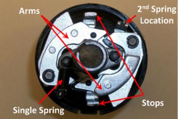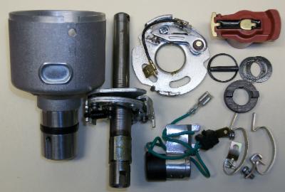 New mechanical distributors with ‘hot’ advance curves are available from many sources. These are usually referred to as 009 distributors and are loosely based on original 019/010 Bosch cast iron distributors made for VW industrial motors and the famous blue 019 Screamers popular with bug enthusiasts since the sixties. Older cast iron distributors were replaced with the aluminum body 009 (the full original part number was 0231 178 009) , which were made in Brazil by Bosch for a time and now are probably all made in Asia (although some claim to be Brazilian, for what it’s worth). These distributors are really quite a bargain, sold with a condenser, rotor, points, and cap. Aside from some ‘you get what you pay for’ differences in manufacturing quality (where it is tough to match the quality of the early Bosch precision instruments), the advance mechanism of the 009 differs in several ways from original cast iron types. They use linear spring tension alone to counter the outward motion of advance weights, compared to the tension plus spring flexure of older mechanisms. The result is a linear timing increase versus the more curved transition of an original. For a more complete description of the advance mechanism of the Bosch distributors for Porsches, see the TechTips article on Distributors and Springs. These replacement distributors use a single stiff spring rather than two - but the advance plate does allow for another. The parts and inner workings are shown below. Also see the TechTips article on Modifying an 009 Distributor for use in a higher performance motor.