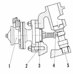 The steps required for removal of a C/912 pump is quite simple by disconnecting inlet and outlet hoses, removing attaching nuts, and then removing the pump (1) and insulating spacer (2). Installation is the reverse. There is no adjustment of the plunger spacing necessary during installation as this is determined internally to the pump itself.