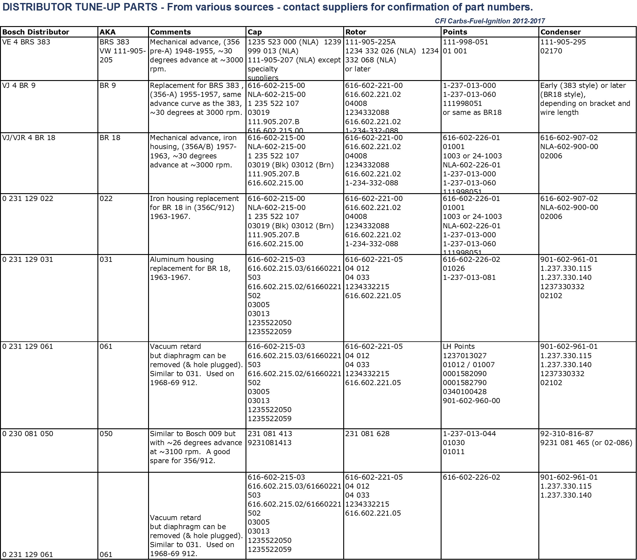 This table of ignition tune-up parts for the Bosch distributors used in Porsche 1600 motors comes from various sources and includes cross references to VW, Porsche, Bosch, and supplier part numbers. Suppliers should be contacted for confirmation and availability of parts or suitable alternatives. Parts for the oldest distributors (such as the BRS 383 and VW 111-905-205) are no longer available and specialty vendors must be sought out. The table is updated as additional information becomes available.