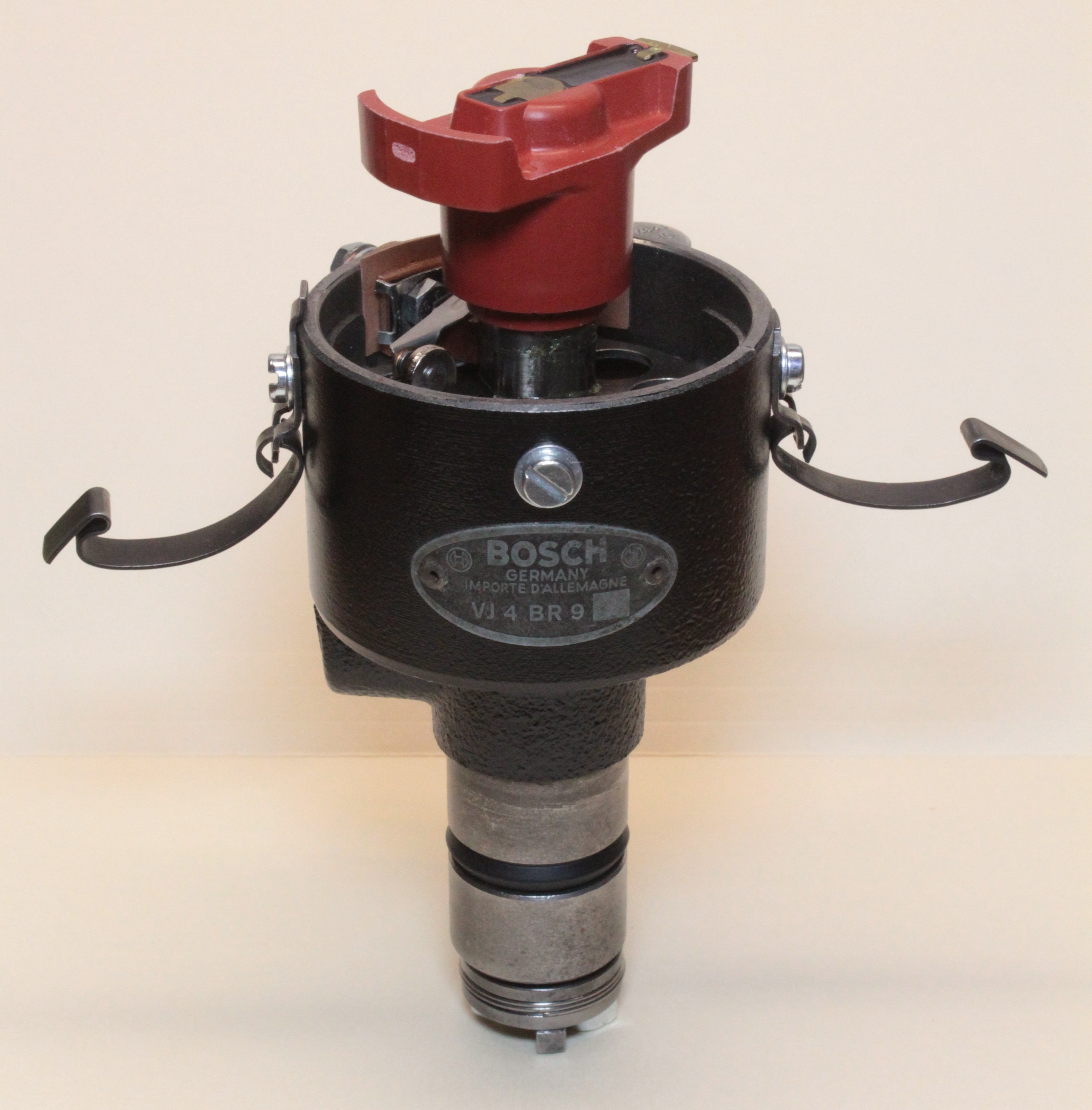 The cast iron Bosch 383 distributor together with the BR9 were the first that were used in the Porsche 356. The advance of these older distributors is a bit lower than later models, with slight less roll-off above idle at higher revs. Differences between their advance curves and the BR18 are within the spec. limits of both so little performance difference will be noticed. The 383 used a flat top distributor cap, which is no longer available. Searching might turn one up, but at a premium. Rotors are nearly as rare. Cap clips were either the wire type or parkerized steel, as the later model clips. The BR9 uses the later style cap.