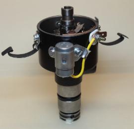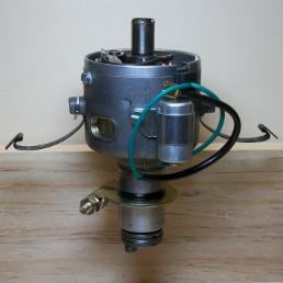 All hardware is cleaned and plated or replaced as needed. Cast iron bodies are cleaned, acid-etch primed, and painted to match factory finish. The ID tag (9) is replaced if needed and available. Internal fiber thrust washers (26, 28) are replaced with OEM or Delrin washers to spec. Slider plates (20) are replaced with new to spec. Friction and contact areas are inspected and polished. Bushings are inspected and replaced if needed. All moving parts are confirmed to operate as new. Breaker plates (35) are cleaned and nickel plated as needed. Advance springs (24) are replaced with new if needed to achieve proper advance curve, as tested on a Sun 404 distributor testing machine. Functional tests include electrical resistance, breaker point tension, cam lobe accuracy, breaker alignment, point dwell and variation, centrifugal advance calibration, and vacuum advance/retard (when applicable). Condenser (3) is tested and rewired or replaced. Condenser bracket (4) is replated or replaced as needed. Shaft (15) play is tested and end play is adjusted to <0.1mm as per spec. Points, rotor, and cap are replaced.