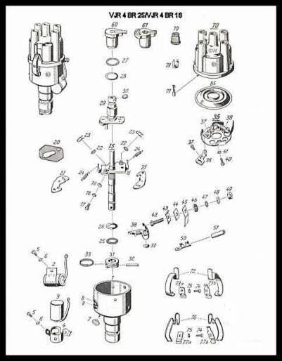 A compatible distributor cap is part# 231.081.413, the rotor is # 231.081.628, the points are # 1.237.013.044, and the condenser is # 9.231.081.465 (and others). The 050 distributor is 90° offset from the original BR18/022 where plug #4 is placed at the normal #1 position. This should be taken into account and instructions are provided by CFI for proper installation.