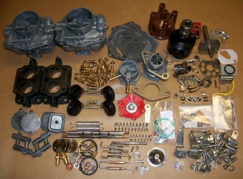 Array of restored and rebuild parts for Zenith 32NDIX carburetors, a Pierburg fuel pump, and a Bosch 022 distributor for a 1964 Porsche 356C, ready for assembly and test.