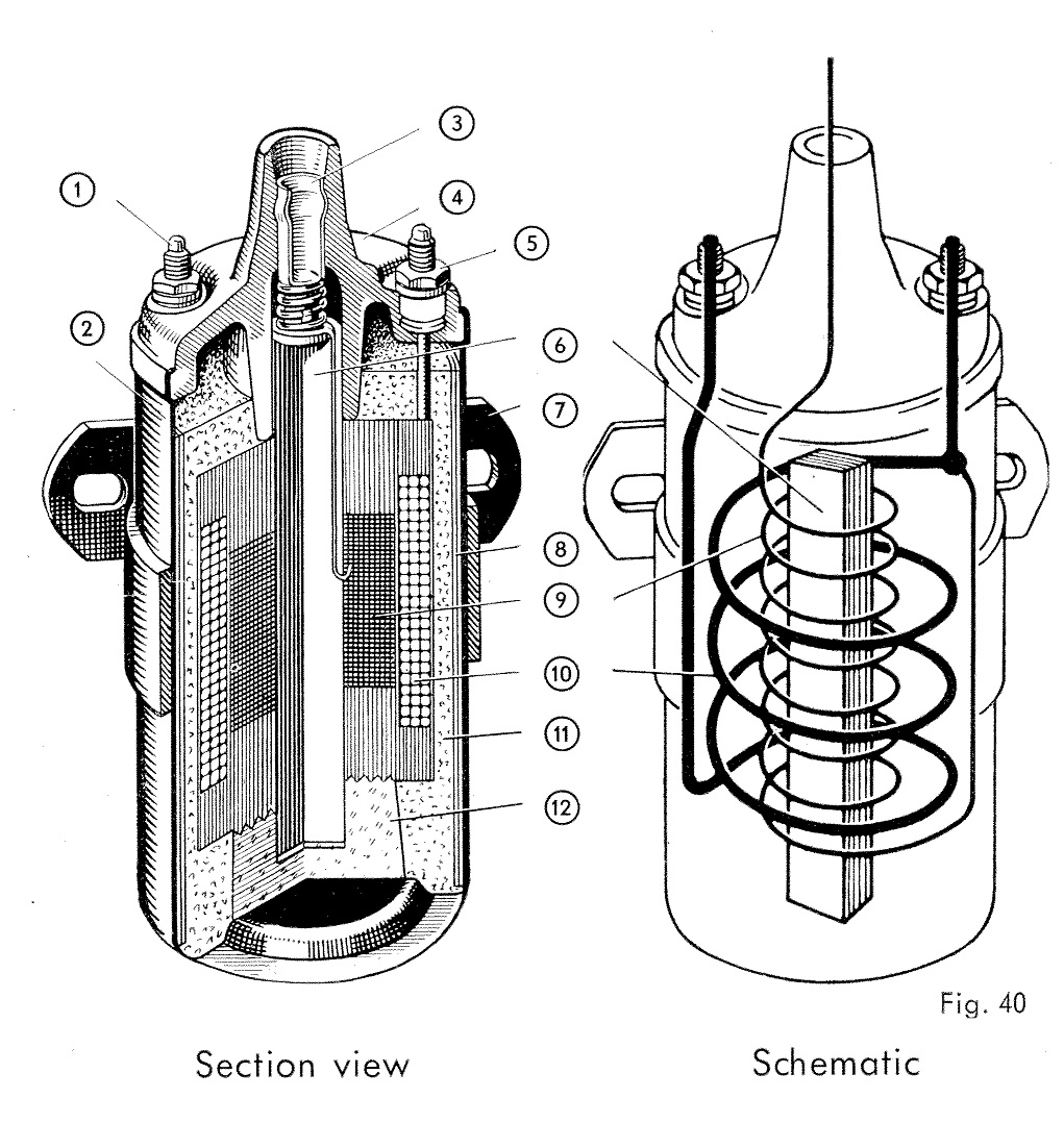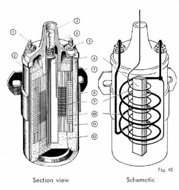 Components of a Bosch coil are seen below. The 6-12 volts provided by the battery is converted to high voltage ignition current by the coil. The secondary winding consisting of many turns of thin wire is wound around a laminated iron core. The primary winding consisting of a few turns of heavy wire is wound around the secondary windings. The iron core is supported by a ceramic insulator at the bottom and by the coil cap at the top. The coil is enclosed in a soft iron shell which acts as a magnetic conductor. The Bakelite cap with the HT socket and terminals is secured to the metal housing. The coil is filled with an insulating compound to ensure good heat dissipation from the windings to the metal casing.