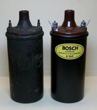 We can test and restore original coils that meet the above conditions and show no other signs of failure. The process involves cleaning and polishing of the insulating cap, cleaning and stripping the metal housing, and filling any small dents or blemishes. Hardware is restored or replaced. The date code is noted and preserved during the refinishing process. The housing is acid-etch primed and painted with a finish to match original. Original style stickers are applied. The bracket (when furnished) is stripped and zinc-plated, as original. We also can supply plated original or replacement brackets.