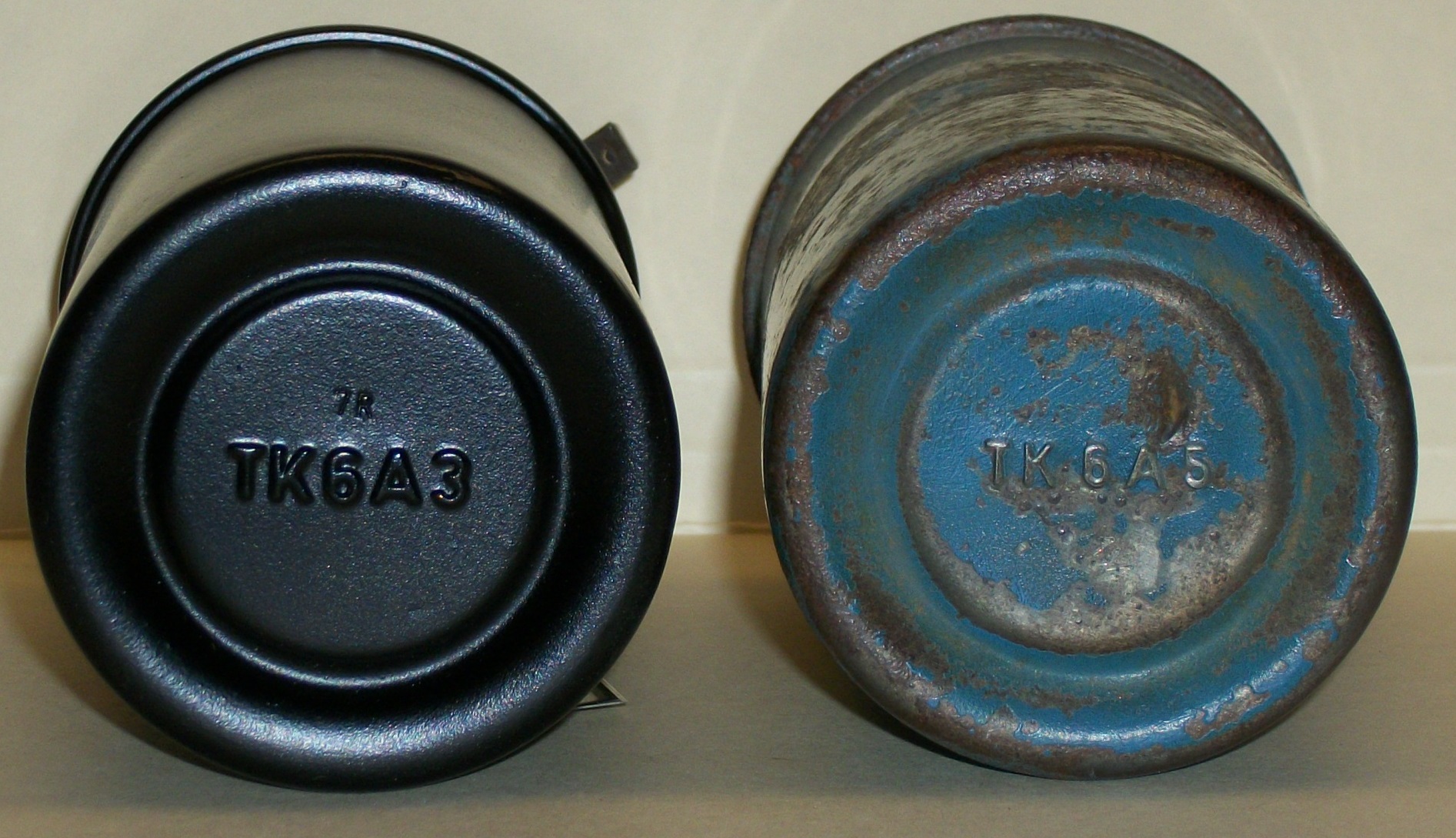 The 6V coils used in the 356 were stamped with model number TK6A3 or TK6A5, though other variations have been used. The standard coil starting sometime around 1953 was the black TK6A3. The blue TK6A5 was used in applications, as described by Bosch, "for especially high number of sparks". This application for Porsche was with the 356 Carrera 4-cam. Date codes are stamped on the base of all original coils, using the Bosch's numbering/lettering system. For example, the coils below are marked 7R (7/60) and 1M (1/56). A date code table can be found at the bottom of this page.