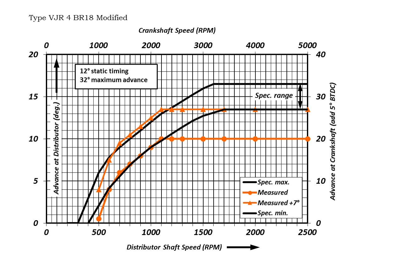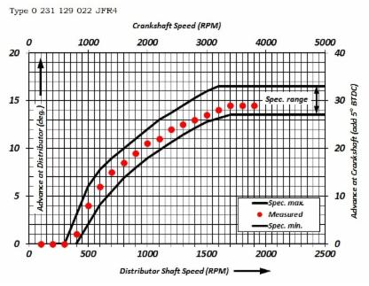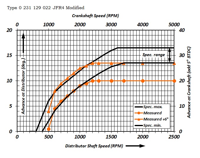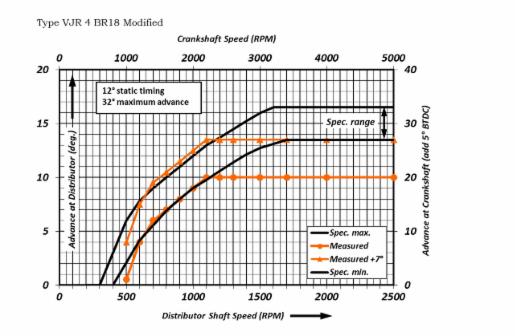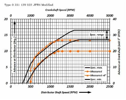 An example of reduced advance 022 distributor is shown below, where measured data is shown together with results when 6° additional static timing is used (resulting in 11° total static timing). Modification can be done to limit advance to a lesser degree as well.