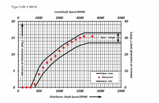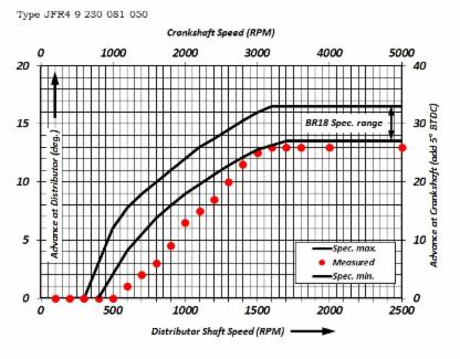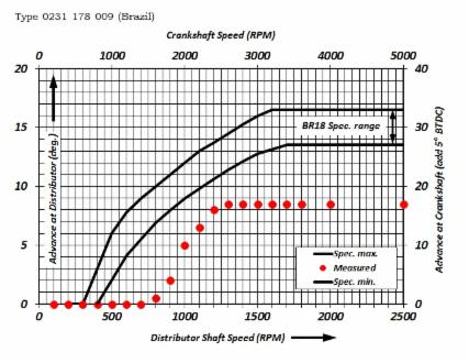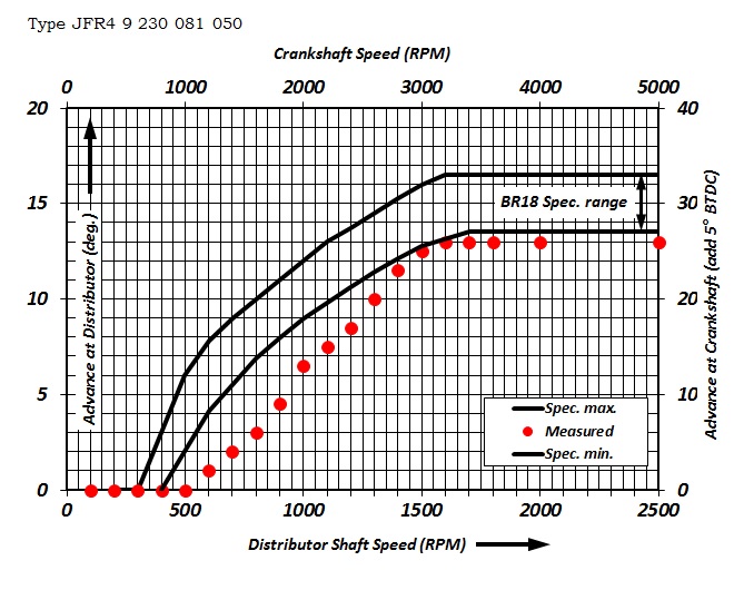 The BR18 distributor has a cast iron body with the main shaft through the bore at its base (unlike the later 022 that used bushings). Maximum mechanical advance is 30° +/-3° at the crankshaft starting at about 3000 RPM, not including a 2-5° initial advance. The total advance should be about 32-33° and no greater than 35°, a bit lower than original factory specs with today's gasoline.