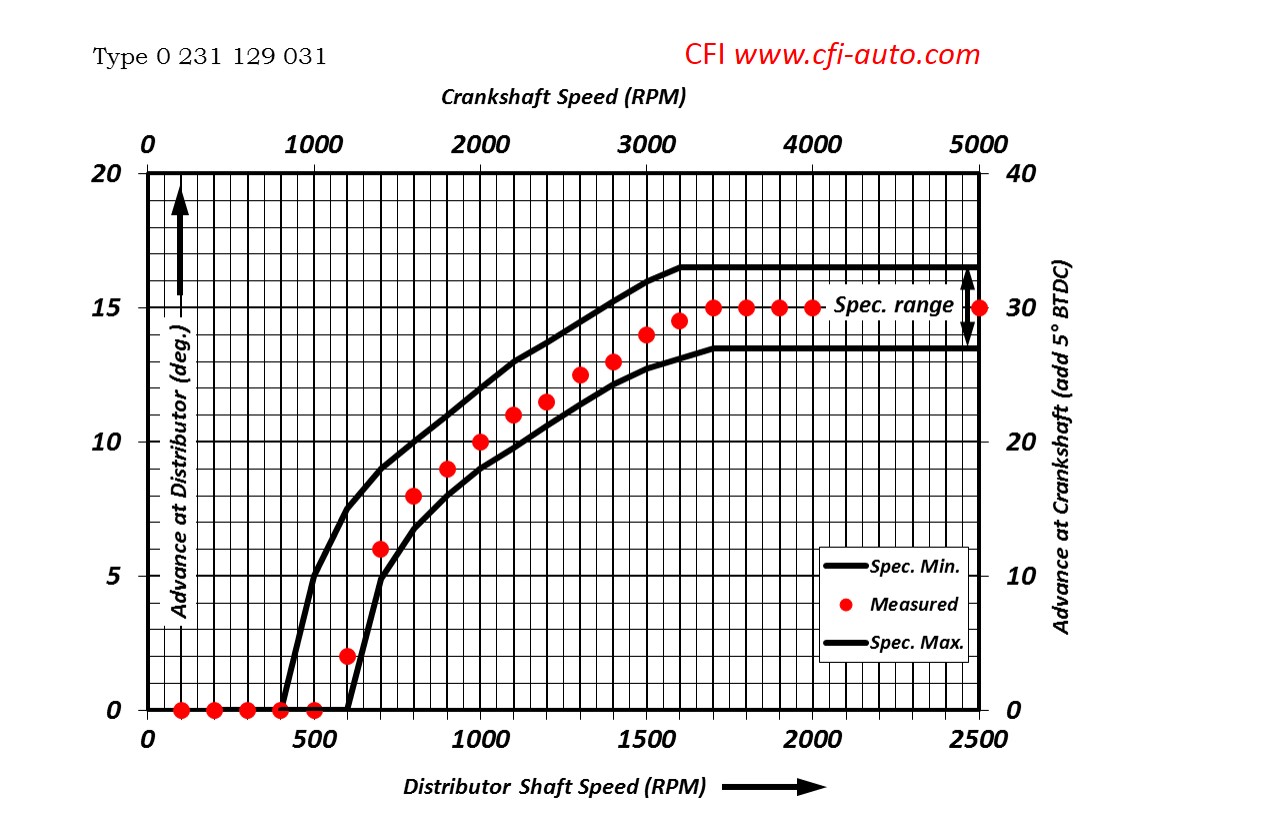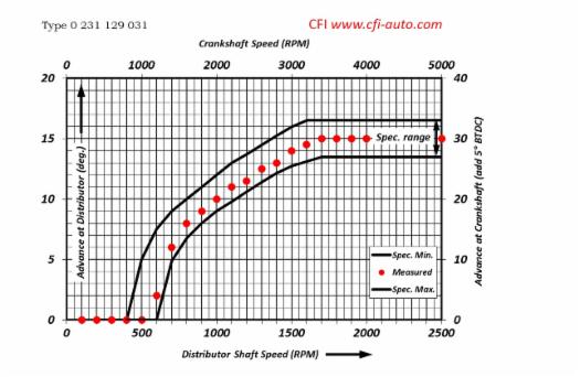 The 050 distributor has been used as the closest Bosch replacement for original distributors. The total advance is about 13° at the distributor and 26° at the crankshaft, not including a 5° initial advance. This is just below the factory spec of 27° but may be better suited for today's lower octane gas.