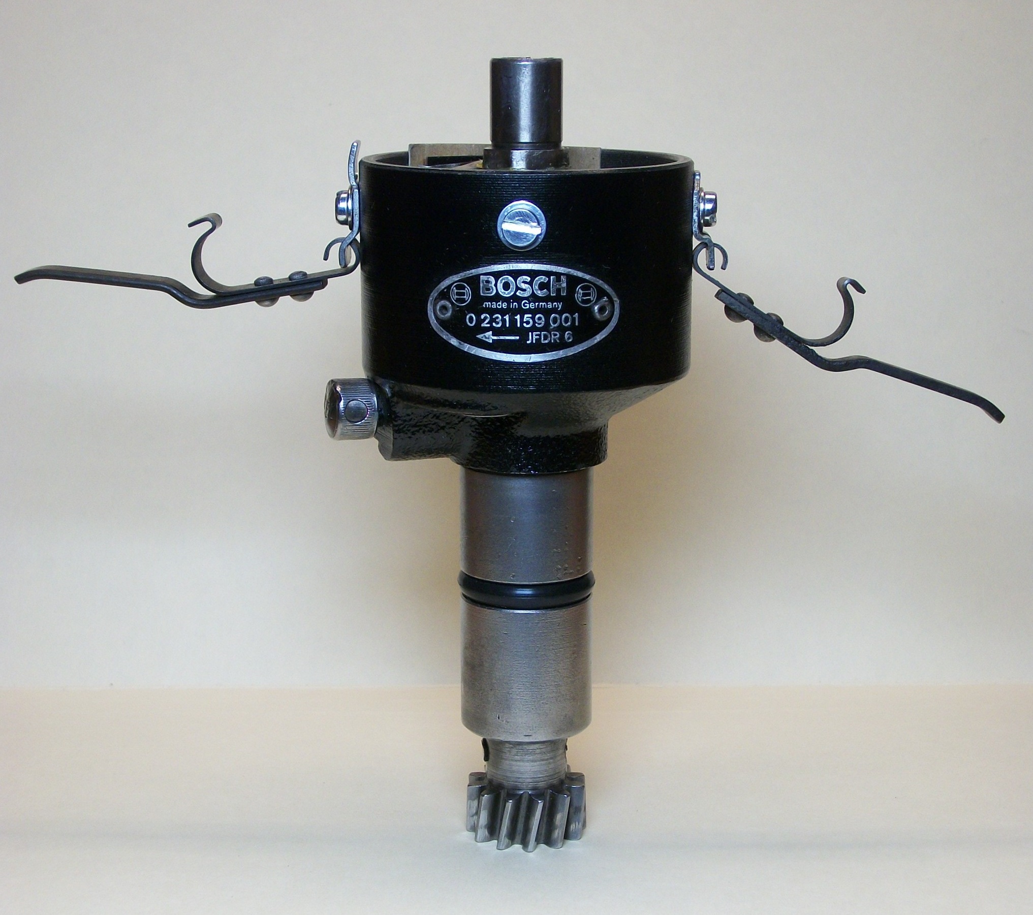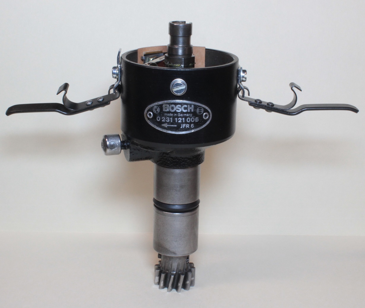 Bosch distributors for early Porsche 911s were originally the cast iron type until about 1968 when aluminum bodied units were introduced. The advance curves for 911 distributors are often two stages, created my a unequal weighting and configuration of the casting arms. This can be seen in several of the advance curves below, shown together with pictures of the advance assemblies. Distributors like the 0 231 121 006 reaches a maximum advance near 30° at high revs, needing less static advance than distributors like the 0 231 159 002. Porsche matched distributors to engine and model type as shown in the table below. Some degree of crossover is possible, as is some 'tuning' of the advance curve. But hard limits and transitions are determined by the design of the advance mechanism and are difficult to modify. In most cases, the distributor designed for a particular Porsche model is the best choice.