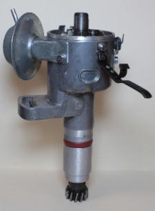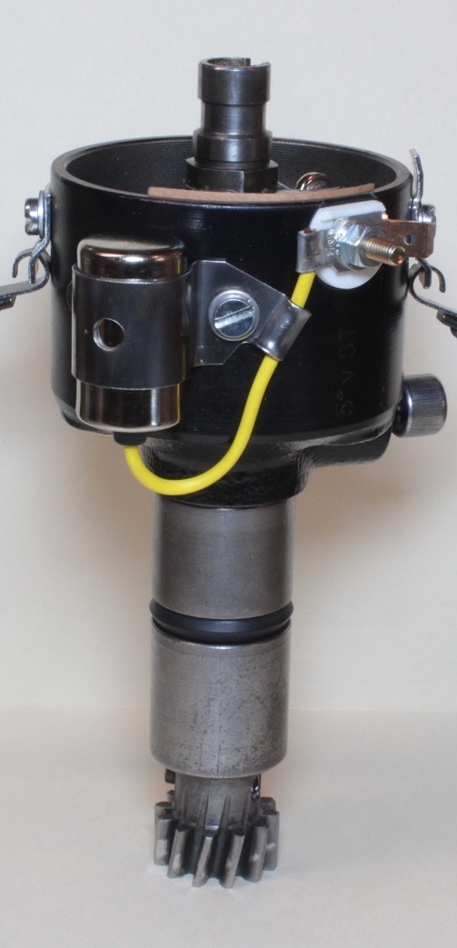 All hardware is cleaned and plated or replaced as needed. Cast iron bodies are cleaned, acid-etch primed, and painted to match factory finish. The ID tag is replaced if needed and available. Internal fiber thrust washers are replaced with OEM or Delrin washers to spec. Slider plates are replaced with new to spec. Friction and contact areas are inspected and polished. Bushings and springs are inspected and replaced if needed. All moving parts are confirmed to operate as new. Breaker plates are cleaned and nickel plated as needed. Functional tests include electrical resistance, breaker point tension, cam lobe accuracy, breaker alignment, point dwell and variation, centrifugal advance calibration, and vacuum breaker and advance (when applicable). Condenser is tested and rewired or replaced. Condenser bracket is replated or replaced. Shaft play is tested and end play is adjusted to <0.1mm as per spec. Points, rotor, and cap are replaced.