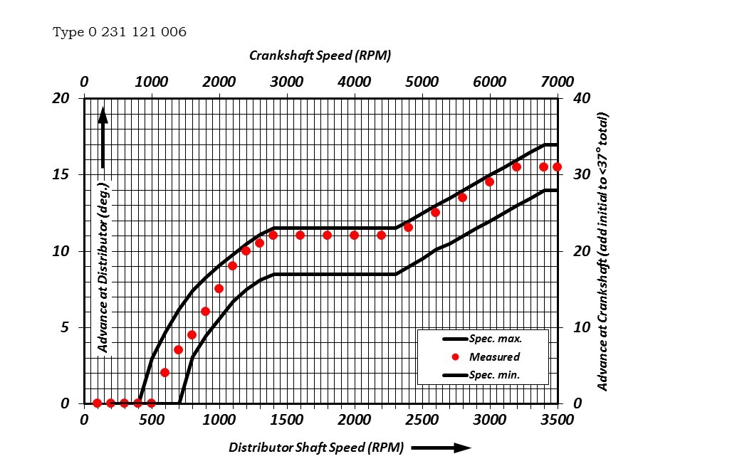Advance for the 121 006 distributor starts at about 500RPM at the distributor (1000 RPM at the crank) and advances toward about 10° at about 1200RPM. The dual advance mechanism is achieved through the use of two separately weighted arms of different length. Advance remains steady until about 2300RPM, where it increases again toward 15° at the distributor (30° at the crank) and leveling off at about 3400RPM (6800RPM at the crank). An initial static advance of 5-7°should be added to keep total advance below 37°.