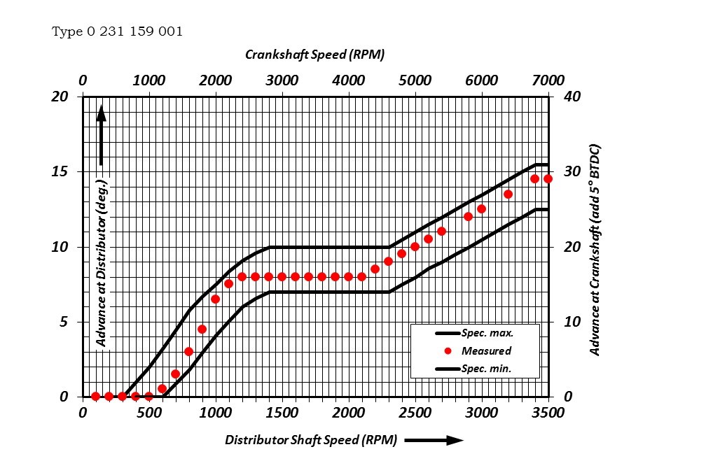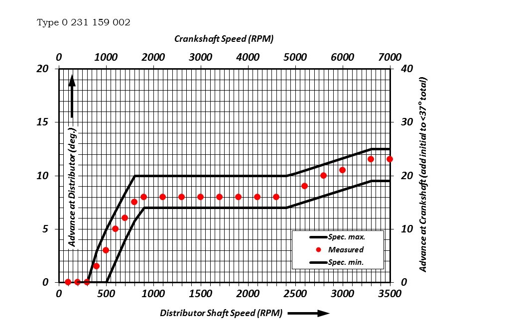 Advance for the 159 001 distributor starts at about 500RPM at the distributor (1000 RPM at the crank) and advances toward about 8.5° at about 1200RPM. The dual advance mechanism is achieved through the use of two separately weighted arms of different length. Advance remains steady until about 2100RPM, where it increases again toward 14° at the distributor (28° at the crank) and leveling off at about 3400RPM (6800RPM at the crank). An initial static advance should be added to keep total advance below 37°.