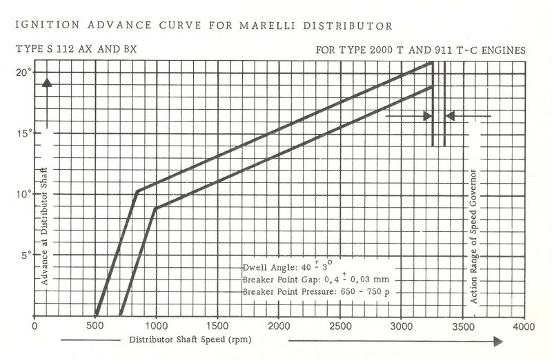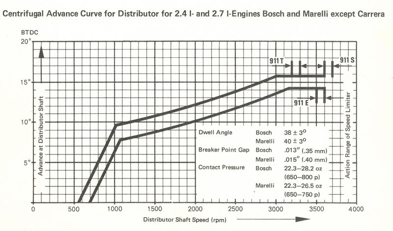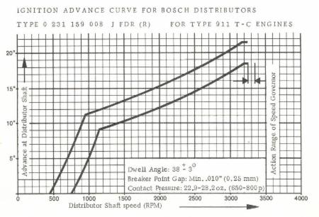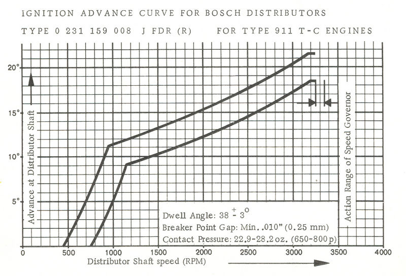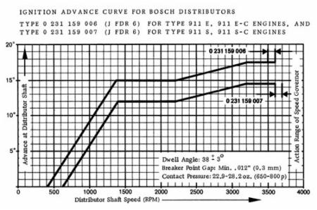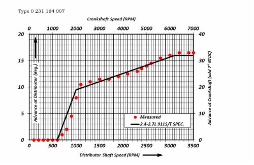 Advance at distributor should fall between limits on the plot. The difference between the 006 and the 007 is the advance limiting rotor used for each 911 type (7300RPM for the 911S and 7100 for the 911E).