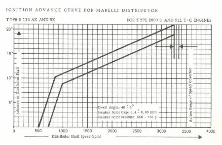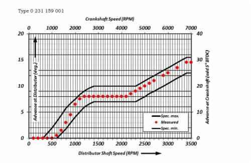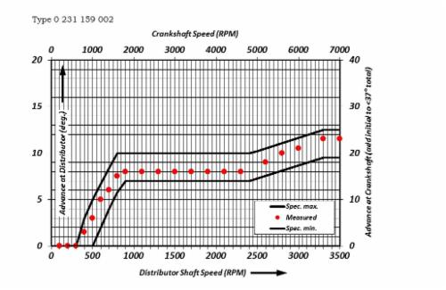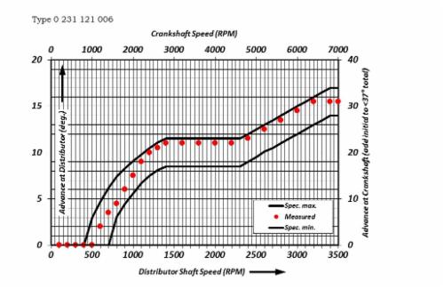 Advance at distributor should fall between limits on the plot. The maximum advance (set by the rev limiting rotor) is 6500RPM)